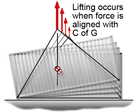 Initially, lifting force line of action is not coincident with C of G and as lifting commences the container will pivot about the heavy end still in contact with support. When top lifting point is self-aligning it will position itself over the C of G and after rotating through the tilt angle it should lift clear from the support with very little swing.