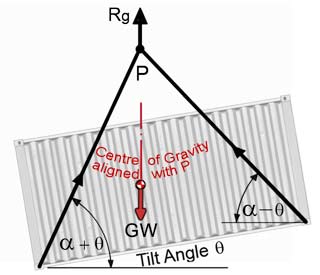 When Unconstrained the container will rotate through θ as it attains equilibrium and the final lifting sling angle becomes (α + θ) and is used to quantify the effect of the tilt angle on the limiting gross weight Rg, given by