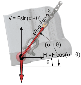 Sling forces are further complicated by the rotation of the container since the lifting sling angles now includes the tilt angle θ, shown below.