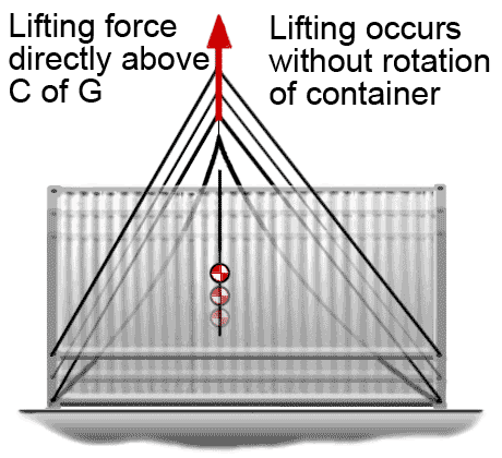 Lifting commences only when the centre of gravity aligns itself with the top lifting point P when the C of G and P are vertically aligned. For slings of equal length the container will rotate and could cause serious problems.