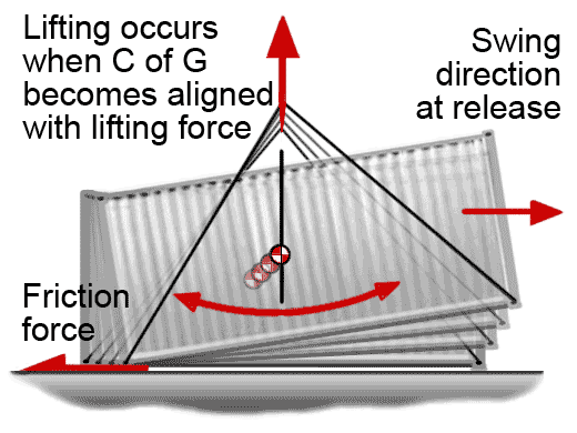 Initially, lifting force line of action is not coincident with C of G and as lifting commences the container will pivot about the heavy end still in contact with support. When top lifting point is self-aligning it will position itself over the C of G and after rotating through the tilt angle it should lift clear from the support with very little swing.